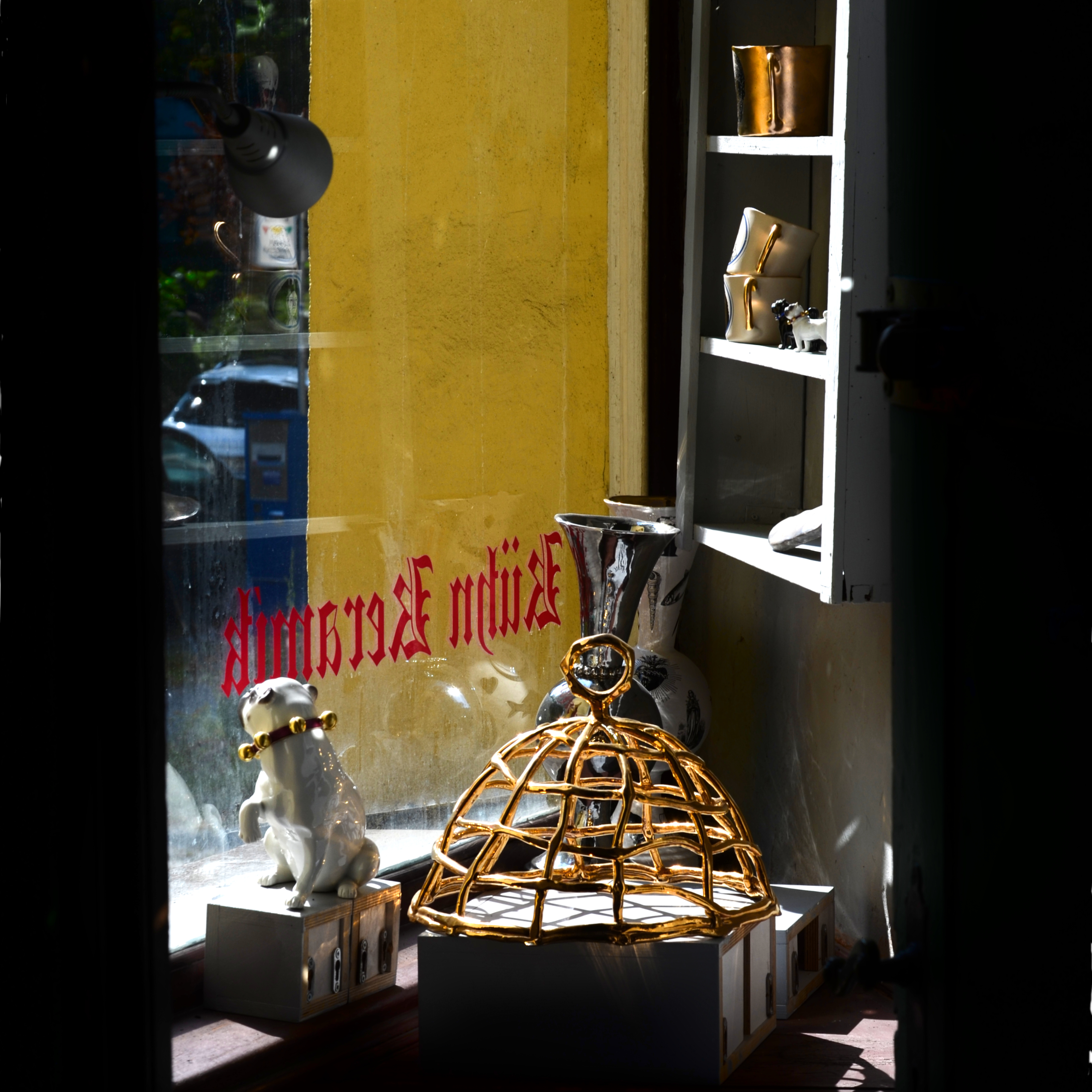 Während eines Spaziergangs mit unserem Karlos entdeckten wir die historische "Anhalter Apotheke", welche Ende 2009 nach 120 Jahren Betrieb geschlossen wurde. Die Apothekenräume sind immer noch mit den Möbeln aus dem 19. Jahrhunderts ausgestattet und bieten ein phantastisches xxx. Die Räume sind knapp 6 m hoch, verziert mit üppigen Stuck und mit aufwändig gemalten, Holz-Intarsiendecken vortäuschenden Deckenbemalungen. Die alte Holzmöblierung mit ihren zahlreichen Regalen, von Alter und sorgfältig mit Holzpolitur gepflegtem Glanz shimmernd sind eine perfekte Möglichkeit, die Kühn'sche Welt der Keramik zu präsentieren.